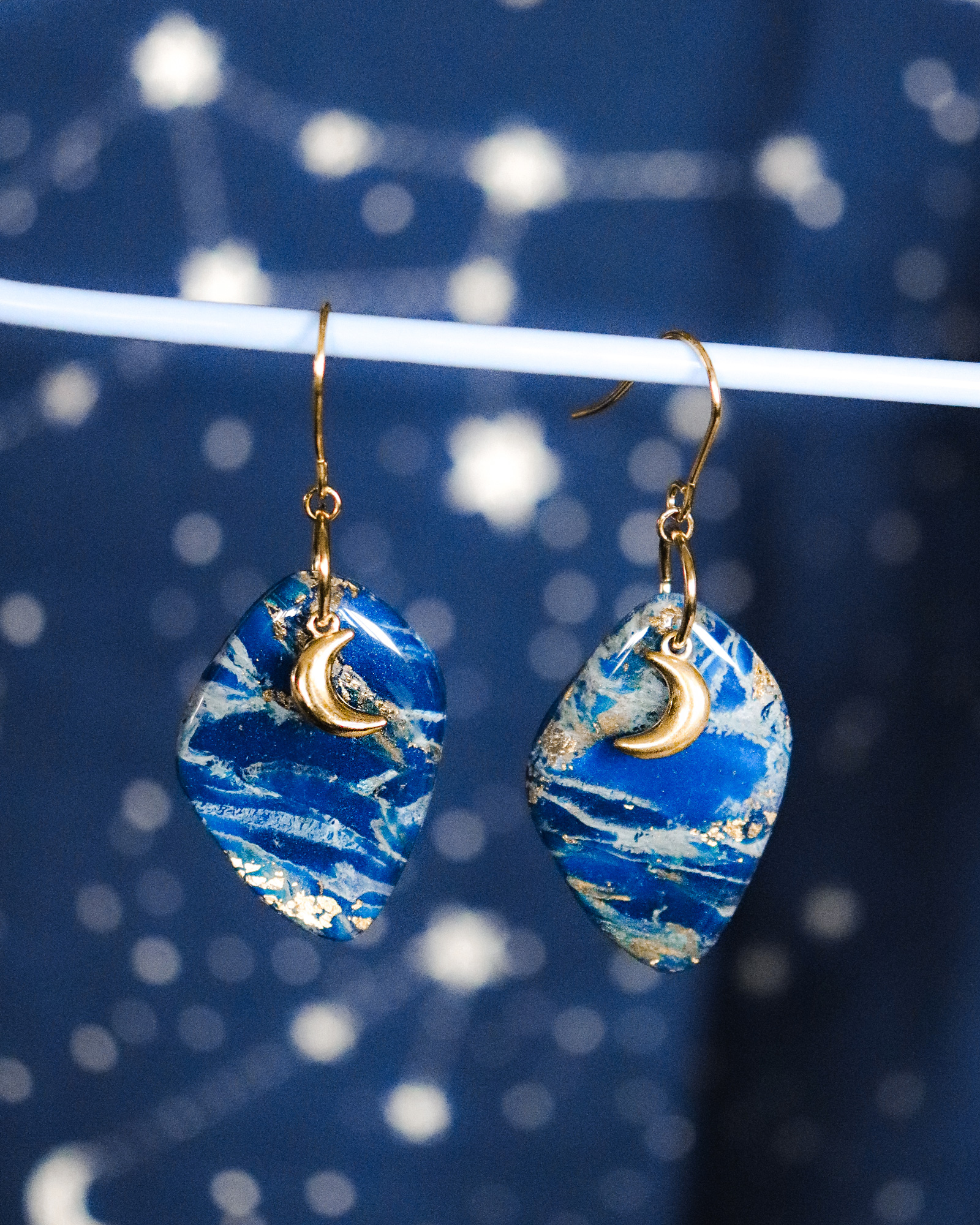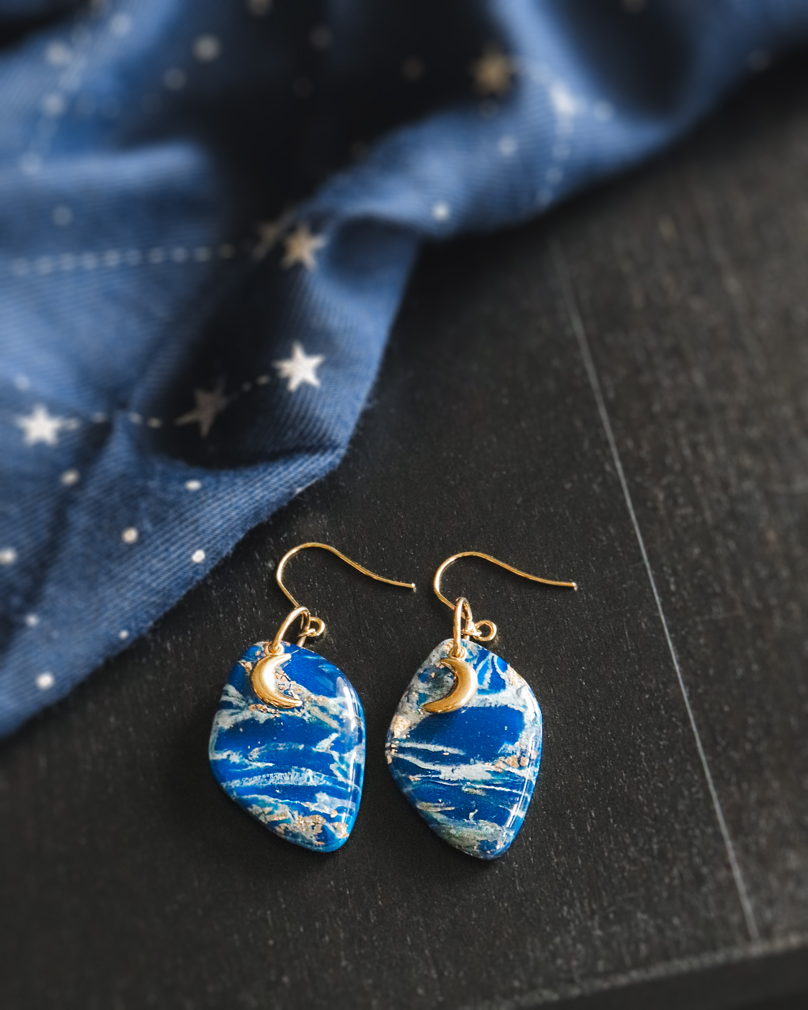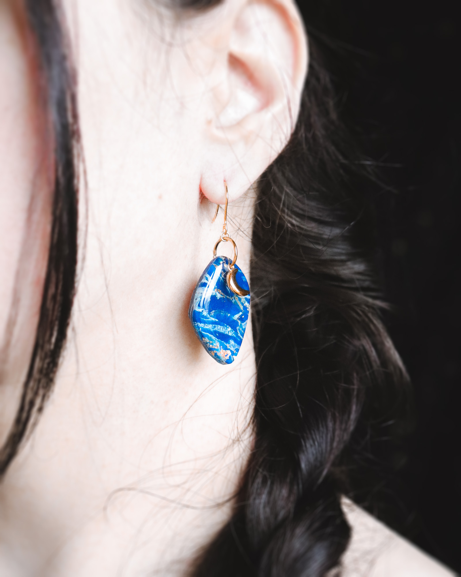 Des boucles d’oreilles modernes et discrètes pour les amoureuses du bleu, avec une touche de doré.