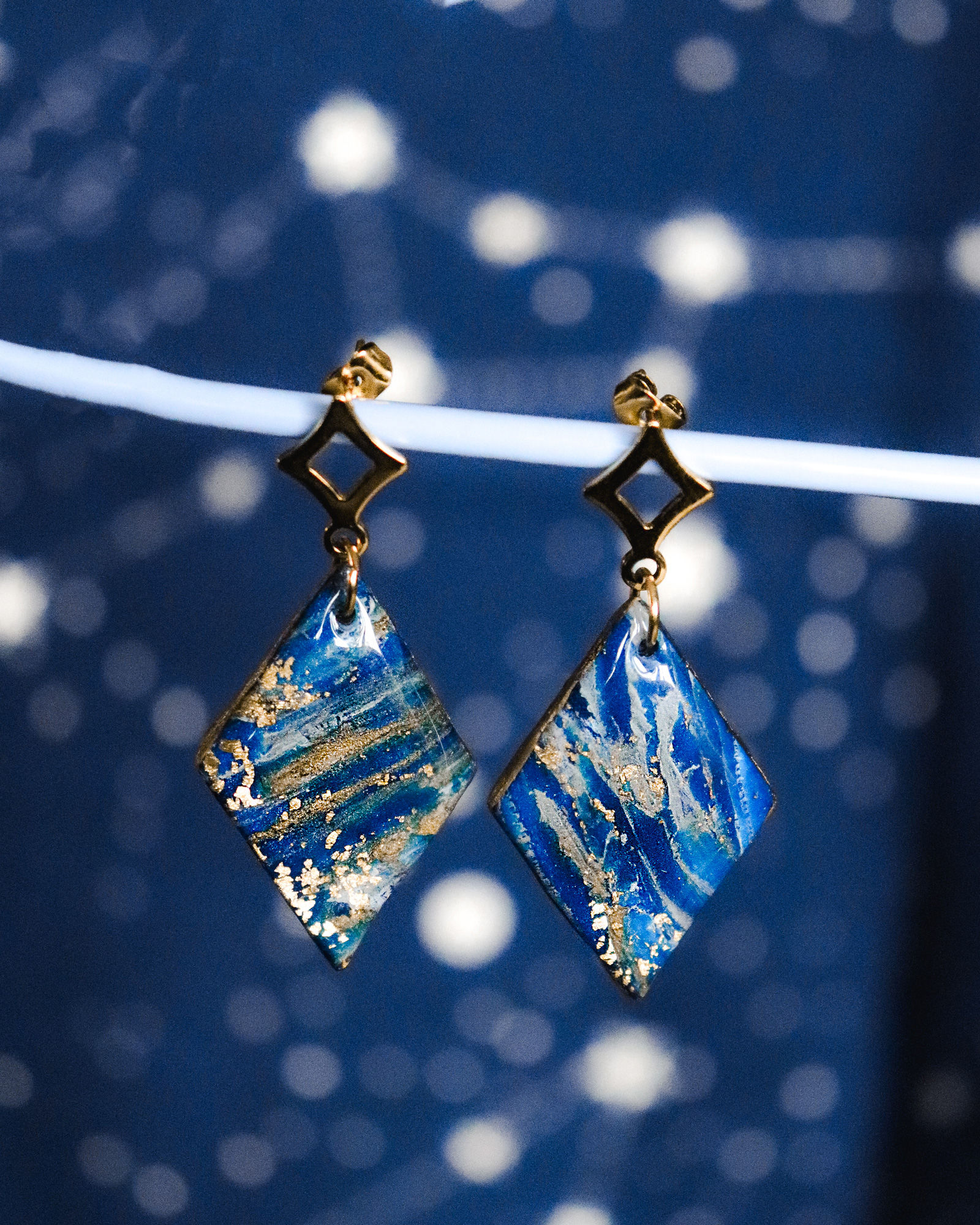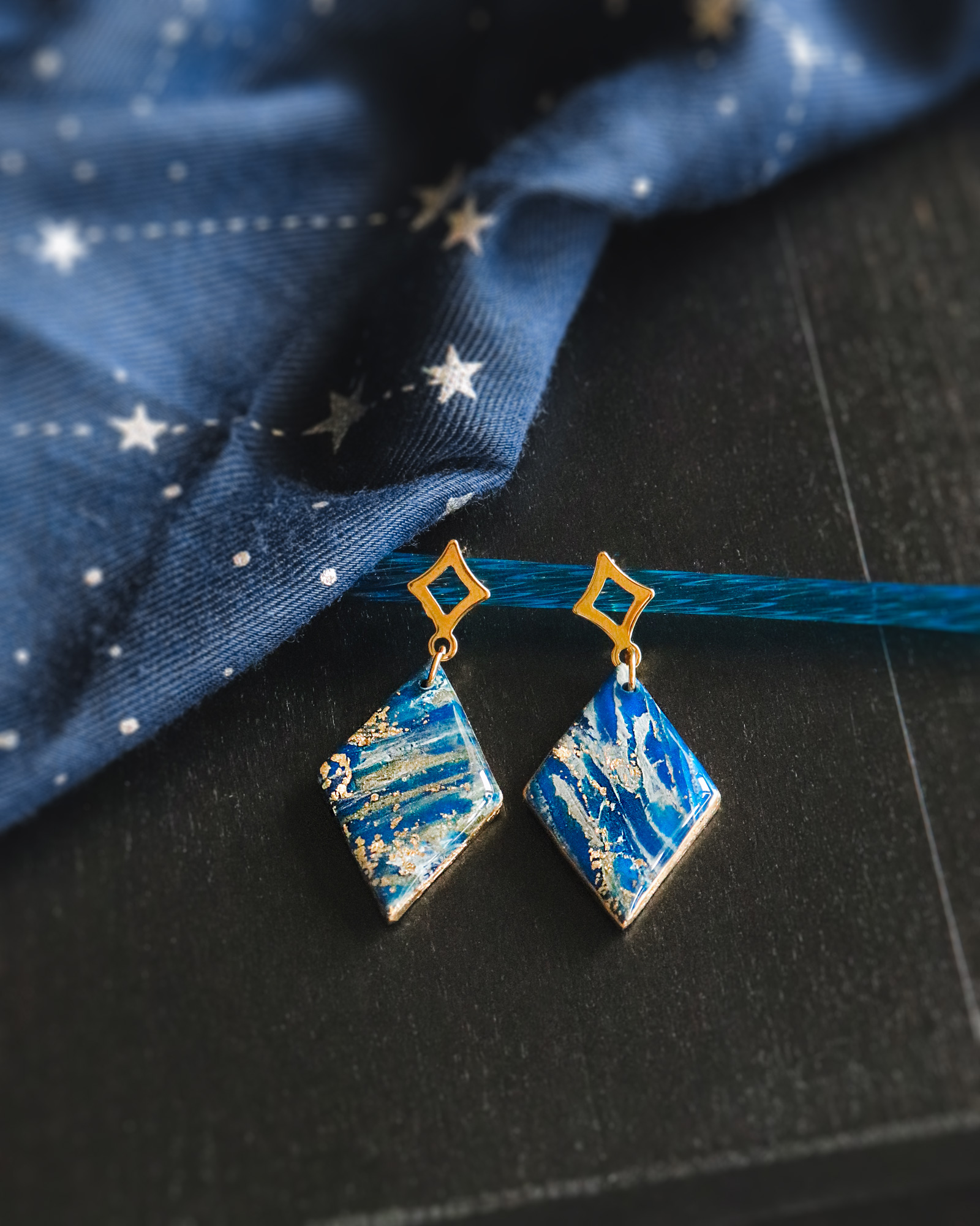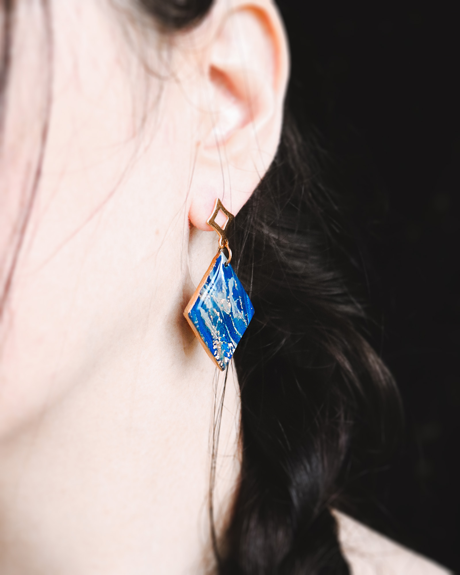 Des boucles d’oreilles modernes et discrètes pour les amoureuses du bleu, avec une touche de doré.