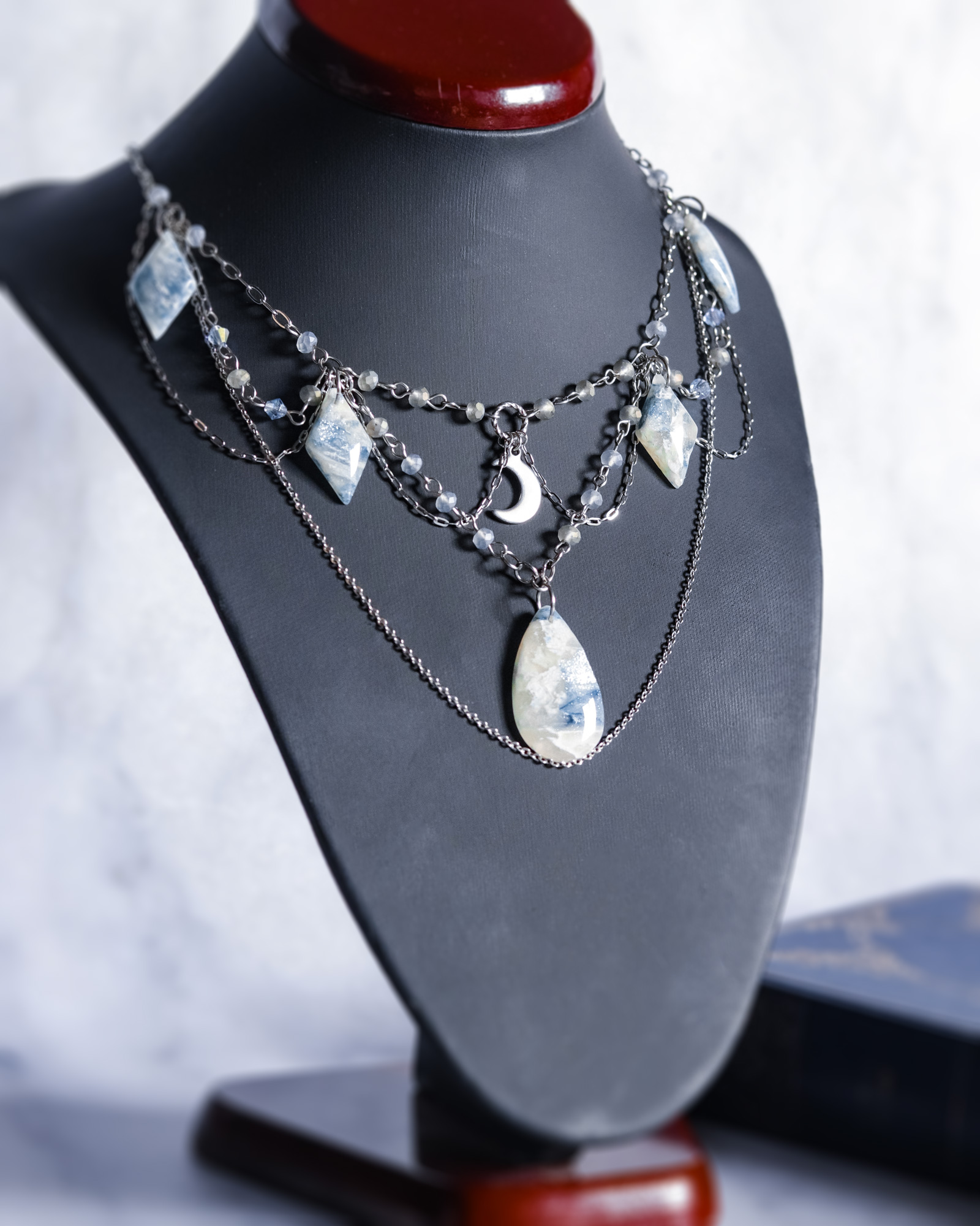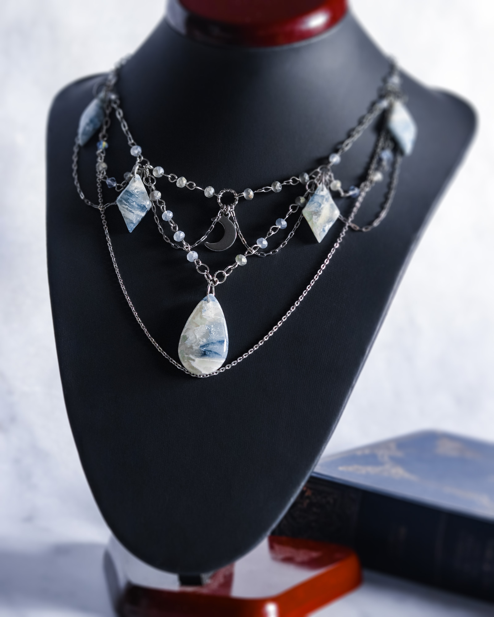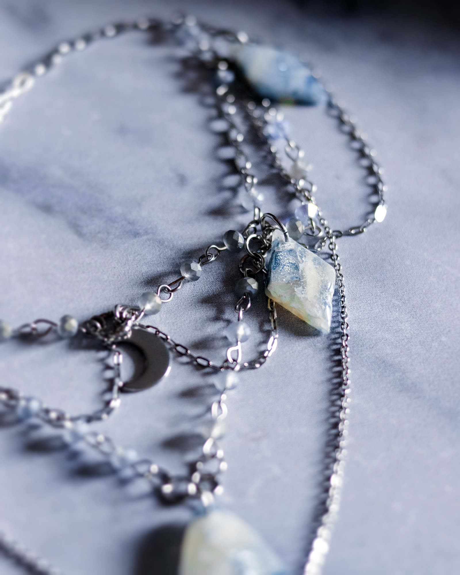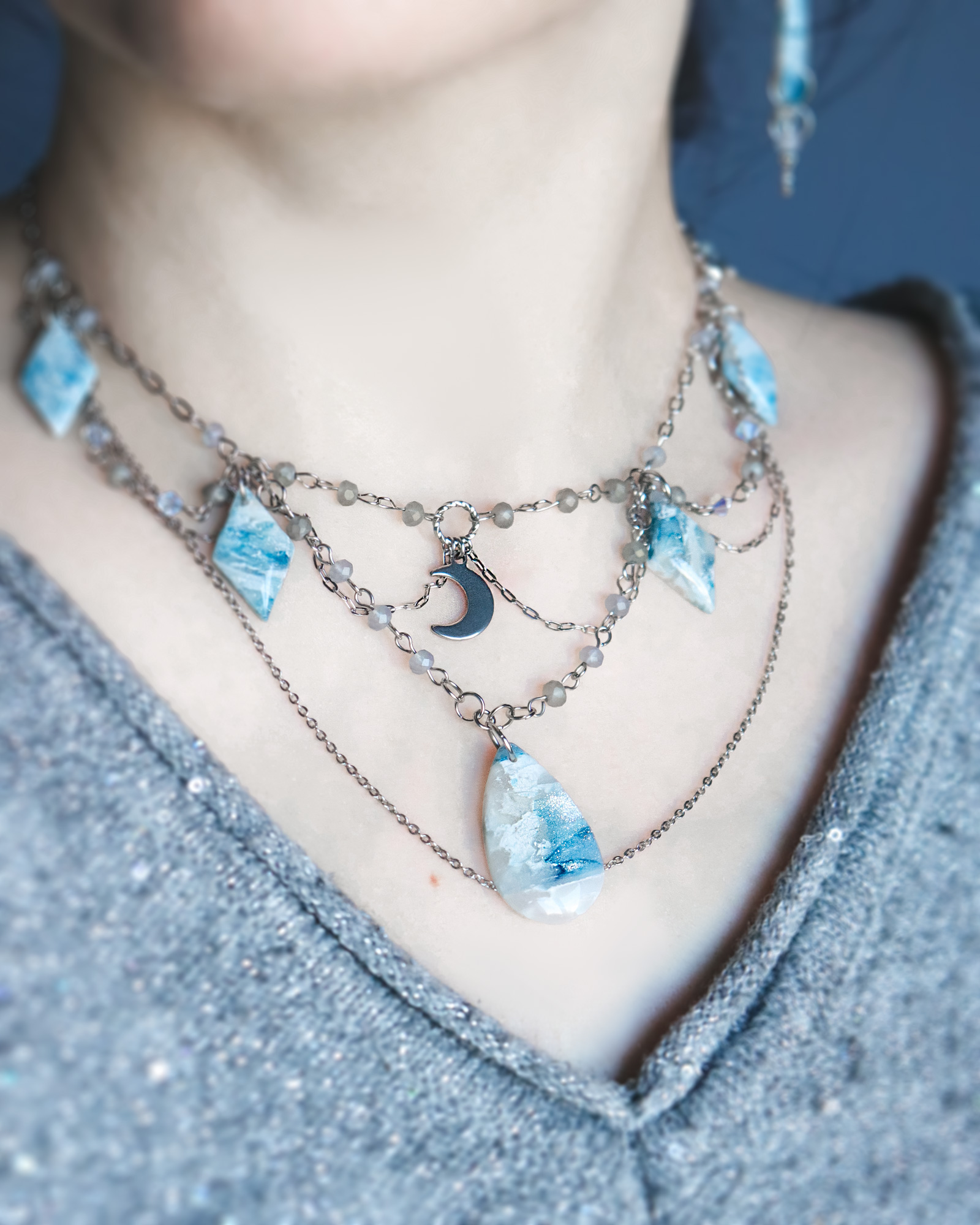 Brillez de mille feux avec ce splendide collier hivernal. Une pièce délicate et précieuse dotée de plusieurs rangs, de chaînes en acier, de perles de verre et de cabochons réalisés à la main dans une unique teinte glacée. De douces nuances bleues et blanches, un rien de scintillement, et vous voilà parée comme une fée des neiges parée de sa magie. Un bijou fait-main pour celles qui ont constamment la tête dans les étoiles (ou dans les livres), et qui se rêvent en princesse.